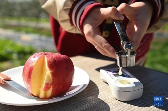 10月20日,西北農(nóng)林科技大學(xué)科研人員在洛川蘋果試驗(yàn)站檢測(cè)蘋果品質(zhì)。