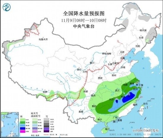 11月8日至9日,貴州東部、江漢、江淮南部、江南大部、華南北部等地先后有中到大雨,其中,湖南中部、江西中部、福建西北部、浙江西南部等地部分地區(qū)有暴雨。