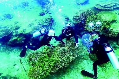 海底護林員在海南省陵水黎族自治縣分界洲島海域清理垃圾、移植珊瑚斷肢。張杰攝