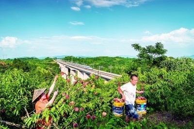 湖南省芷江侗族自治縣的果農(nóng)在鐵路橋附近摘桃子。高鐵的建設開通對沿線群眾發(fā)展產(chǎn)業(yè)有著積極作用。李小平攝