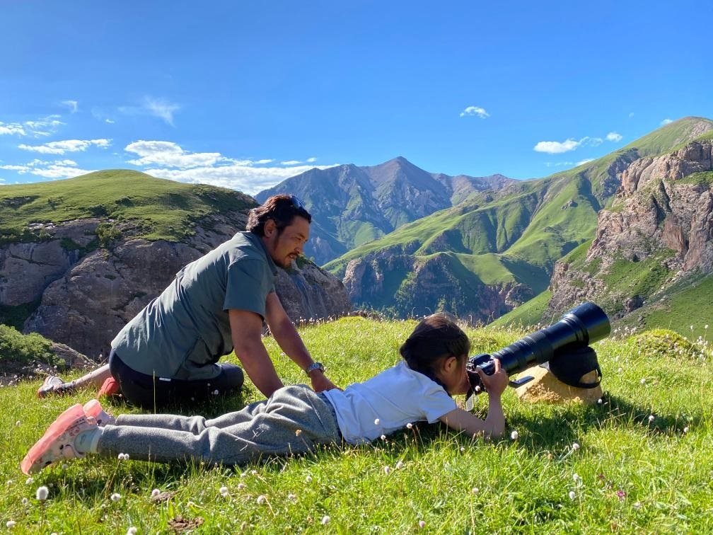 2020年7月,達(dá)杰在指導(dǎo)女兒拍攝雪豹。(受訪對象供圖)