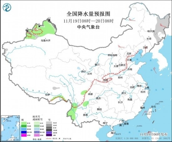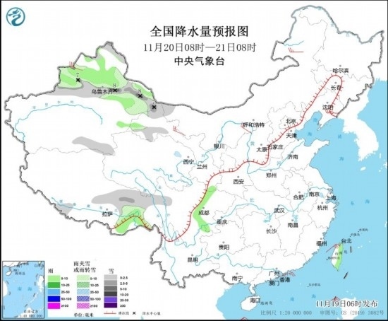 11月20日08時至21日08時,新疆沿天山地區(qū)和東部、內(nèi)蒙古西北部、西藏東部、甘肅河西、川西高原北部等地部分地區(qū)有小雪或雨夾雪,其中,新疆伊犁河谷和東部、西藏東北部等地部分地區(qū)有中到大雪(5~8毫米)。新疆北部、西藏東南部、四川盆地西部、臺灣島東部等地部分地區(qū)有小雨。內(nèi)蒙古河套地區(qū)、甘肅河西、遼寧東部、新疆北部等地部分地區(qū)有4~6級風(fēng)(見圖3)。
