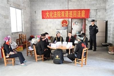 大化法院雙語巡回法庭到當(dāng)事人家中調(diào)解案件。