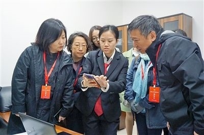 最高人民法院第五巡回法庭干警為代表演示群眾來信一鍵回復(fù)。