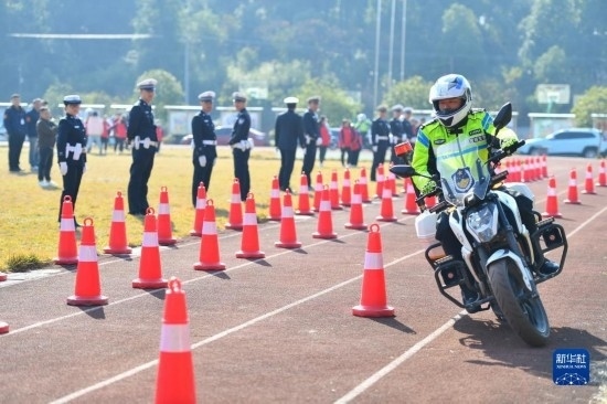 12月1日,在長沙市望城區(qū)新河學(xué)校,長沙市公安局望城分局交警大隊的鐵騎隊員進行技能展示。