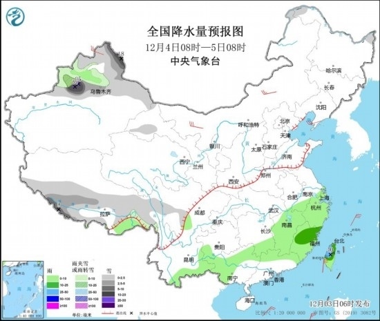 12月4日08時(shí)至5日08時(shí),新疆北部、西藏西南部和東部等地部分地區(qū)有小到中雪或雨夾雪,其中,新疆北疆東部和沿天山地區(qū)、西藏西南部等地部分地區(qū)有大到暴雪,局地大暴雪(20~25毫米)。江南大部、云南東部和南部、華南北部和西部、臺(tái)灣島等地部分地區(qū)有小到中雨,其中,臺(tái)灣島中北部等地部分地區(qū)有大雨(25~40毫米)。內(nèi)蒙古中西部、遼東半島、新疆北部等地部分地區(qū)有4~6級(jí)風(fēng)。