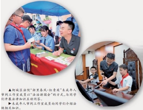 在法治教育課程上,柯城區(qū)法院根據(jù)轄區(qū)學(xué)校數(shù)量多、階段全的情況,在9所試點(diǎn)學(xué)校設(shè)立“紅青庭”校園法治輔導(dǎo)站,分別選任9名法治輔導(dǎo)員和9名法治宣傳員,根據(jù)未成年人身心特點(diǎn),協(xié)助創(chuàng)新法治教育課程內(nèi)容和形式,已就反詐、防性侵等內(nèi)容開展模擬法庭、情景劇等活動(dòng)12次。