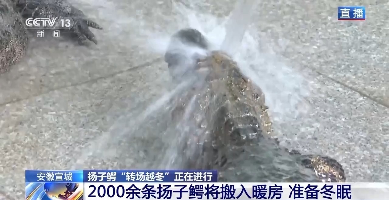 由于今年的溫度比較高,與往年相比,轉(zhuǎn)場越冬推遲了十天左右。轉(zhuǎn)場是按照從小到大的順序。今天是第一天,率先搬家的主要是7歲以下的幼鱷,它們對(duì)環(huán)境的適應(yīng)能力更弱一些,需要盡快搬進(jìn)室內(nèi)。在搬進(jìn)暖房之前,揚(yáng)子鱷需要先進(jìn)行沖洗、消毒。“安家”后,越冬房的溫度會(huì)保持在10℃左右,并且有工作人員定期打掃、保濕,確保揚(yáng)子鱷安全過冬。