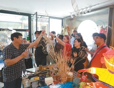 顧業(yè)亮(左一)向游客介紹展示秦淮燈彩制作。圖為南京歷史城區(qū)保護建設(shè)集團有限公司提供