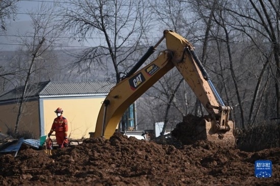 12月19日,救援機(jī)械和人員在青海省海東市民和回族土族自治縣中川鄉(xiāng)金田村清理地震引發(fā)的砂涌。
