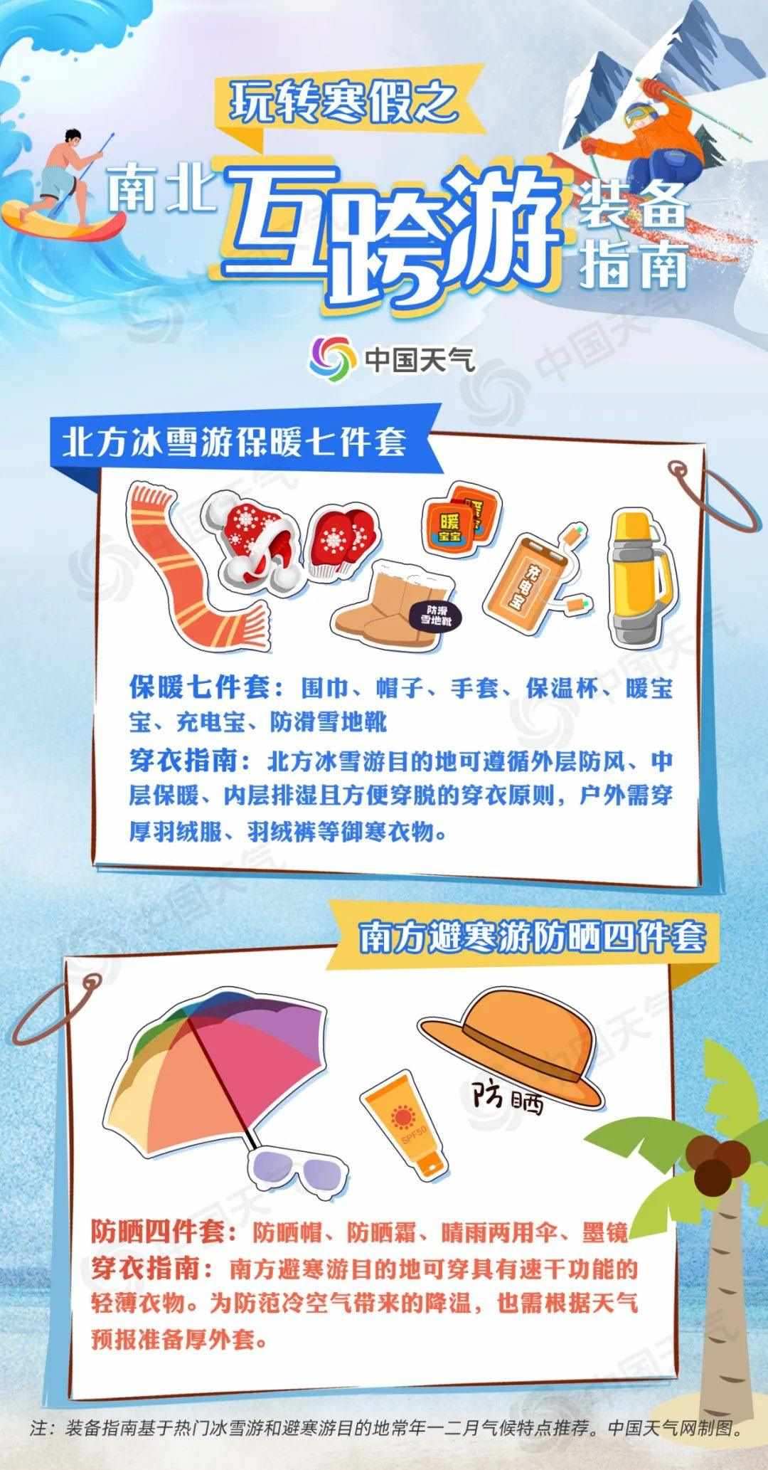 無(wú)論是北上戲冰雪,還是南下避寒游,裝備是否齊全直接關(guān)系到旅游行程的質(zhì)量。對(duì)于前往北方冰雪游的朋友來(lái)說(shuō),防寒保暖至關(guān)重要;南下避寒則要注意防曬防蚊。