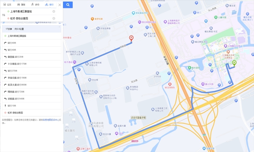 “途經(jīng)滬青平公路時(shí),平臺(tái)也愛規(guī)劃逆行路線?!标愱栮柼峁┑牡?條逆行路線正屬于這一情況。這是從京華路187弄送往南山雨果小區(qū)的一單,平臺(tái)規(guī)劃的路線中,指示騎手從明珠路右拐進(jìn)入滬青平公路向西騎行至葉聯(lián)路再向南。可是,滬青平公路在葉聯(lián)路路口處沒有過街橫道線,此時(shí),平臺(tái)索性規(guī)劃騎手沿著滬青平公路南側(cè)逆向騎行。1月8日,記者實(shí)地走了一遍這段路線:若騎手沿著滬青平公路北側(cè)騎行,需一直向西騎到徐盈路才能過街,再沿著滬青平公路南側(cè)向東抵達(dá)葉聯(lián)路。手機(jī)顯示,繞行路線比美團(tuán)平臺(tái)規(guī)劃路線遠(yuǎn)了1.2公里。