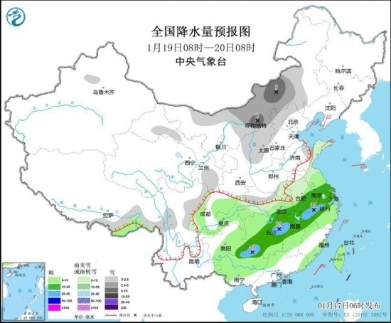 圖3 全國降水量預(yù)報圖(1月19日08時-20日08時)