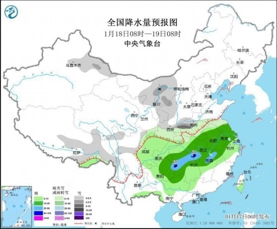1月18日08時至19日08時,內(nèi)蒙古西部、新疆北疆東部、西藏東部、西北地區(qū)東部、黃淮西部和南部、川西高原北部等地部分地區(qū)有小到中雪或雨夾雪,局地有大雪(5毫米)。江淮、江漢、江南北部和西部、西南地區(qū)東部、廣西等地部分地區(qū)有小到中雨,其中,湖南北部和西部、江西北部等地部分地區(qū)有暴雨(50~60毫米)。內(nèi)蒙古中部、遼東半島等地部分地區(qū)有4~6級風(fēng)(見圖2)。