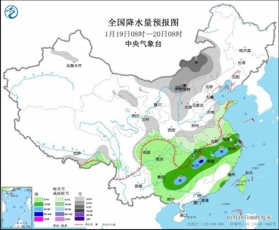 1月18日08時(shí)至19日08時(shí),新疆北部、西北地區(qū)東部、內(nèi)蒙古中西部、黃淮西部和南部、江淮北部、湖北西北部以及西藏東部等地部分地區(qū)有小到中雪或雨夾雪,局地有大雪。江淮南部、江漢東部、江南北部和西部、西南地區(qū)東南部等地部分地區(qū)有中到大雨,其中,湖北南部、湖南東北部和西部等地部分地區(qū)有暴雨(50~60毫米)。內(nèi)蒙古東南部、遼寧大部、華北東部、山東半島、江南東部等地部分地區(qū)有4~6級(jí)風(fēng)(見圖1)。