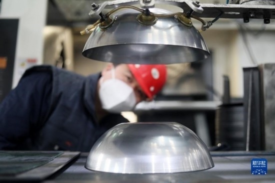 12月21日,在位于隆堯縣的河北三廈廚具科技有限公司生產(chǎn)車(chē)間,工人在操控旋壓設(shè)備。