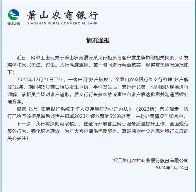 ·杭州蕭山農商銀行柜員對客戶大吼“滾”,銀行回應:扣減5%績效。