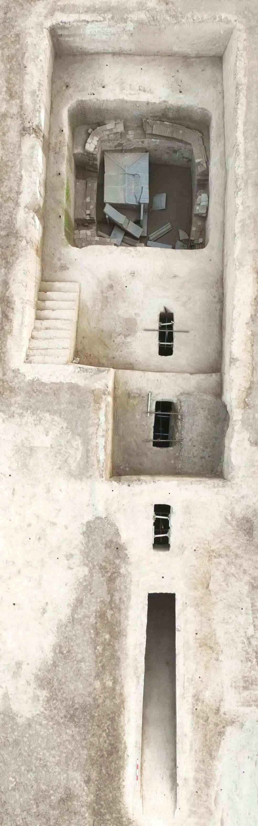 該墓為斜坡墓道三天井單室磚室墓,遭嚴(yán)重盜擾,石門,墓室頂部等均被破壞,墓室內(nèi)各類器物已被盜掘一空,僅發(fā)現(xiàn)有少量陶器殘片。墓道兩側(cè)各分布有兩個(gè)壁龕,壁龕內(nèi)殘存陶雞、陶狗、陶駱駝等動(dòng)物俑七十余件。