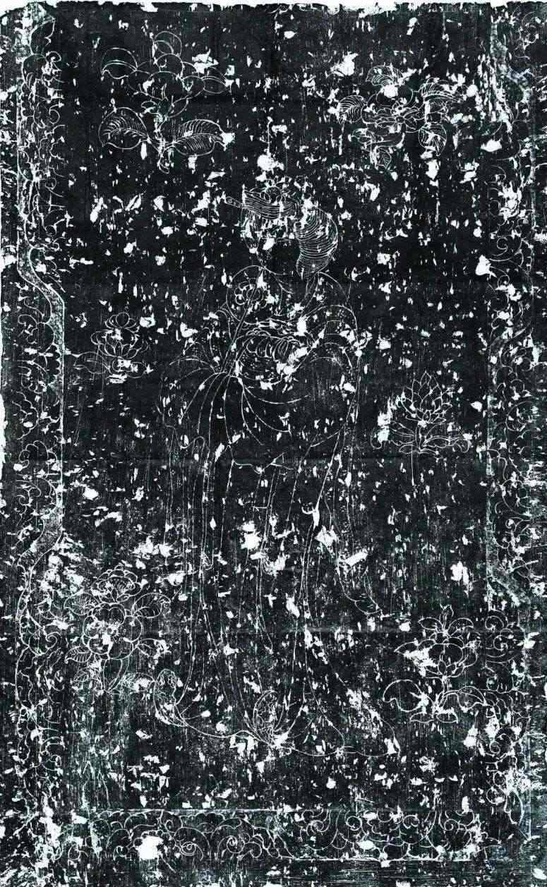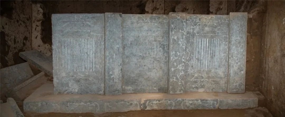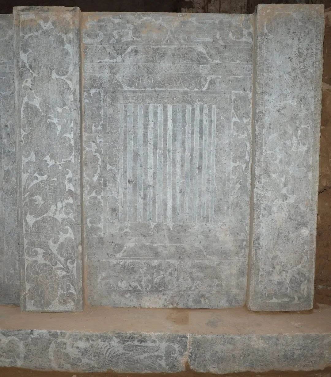 墓室西側(cè)發(fā)現(xiàn)石槨一具,保存較好。石槨面闊三間,進(jìn)深兩間,頂部為廡殿式,僅一側(cè)雕刻有瓦棱;槨身由壁板和倚柱卯和而成,板壁外側(cè)雕刻門窗、卷云及神獸,內(nèi)側(cè)主體為侍女,周邊飾有花草等內(nèi)容;倚柱內(nèi)外均刻纏枝卷草花朵,部分穿插飛禽走獸;基座以七塊石板鋪成,立面間隔刻有壸門圖案,內(nèi)填奔獸圖樣。石槨線刻精細(xì),畫面華麗而不繁縟,人物體態(tài)豐腴而不臃腫,充分體現(xiàn)出盛唐開元時(shí)期圖案靈動(dòng)、富于想象的特征。