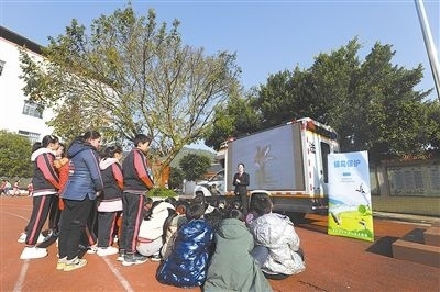 干警利用“車載便民法庭”播放宣傳片,教孩子們認識棲息在當?shù)氐恼滟F候鳥。