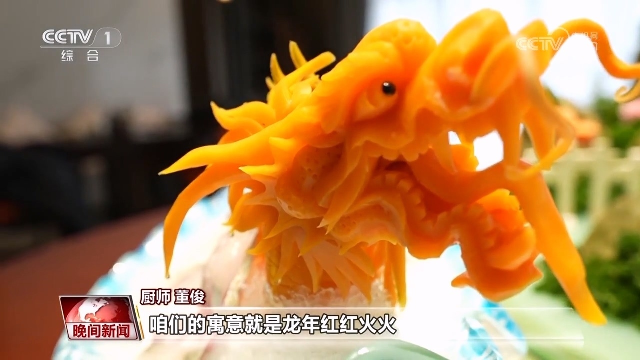 廚師 董俊:把魚切成薄片,用濃湯涮熟,擺盤呈現(xiàn)一條龍的造型,咱們的寓意就是龍年紅紅火火、風調雨順、年年有余。