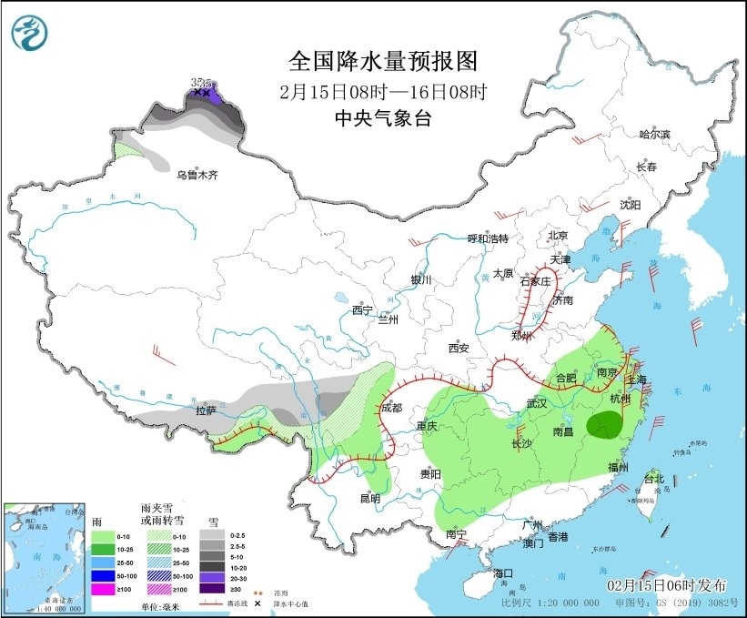 2月15日08時(shí)至16日08時(shí),新疆北部、西藏東部和南部、川西高原中北部等地部分地區(qū)有小到中雪或雨夾雪,其中,新疆阿勒泰地區(qū)有大到暴雪,部分地區(qū)有大暴雪,局地特大暴雪(30~35毫米)。江淮大部、江漢東部、江南、西南地區(qū)東部、華南西部等地部分地區(qū)有小到中雨。西藏中部、內(nèi)蒙古大部、遼寧西部、遼東半島、山東半島、江蘇南部、上海、湖南中北部等地部分地區(qū)有4~6級(jí)風(fēng),其中,浙江中東部部分地區(qū)有6~7級(jí)風(fēng);黃海大部海域、東海大部海域、臺(tái)灣海峽有7~8級(jí)、陣風(fēng)9級(jí)的大風(fēng)(見圖3)。