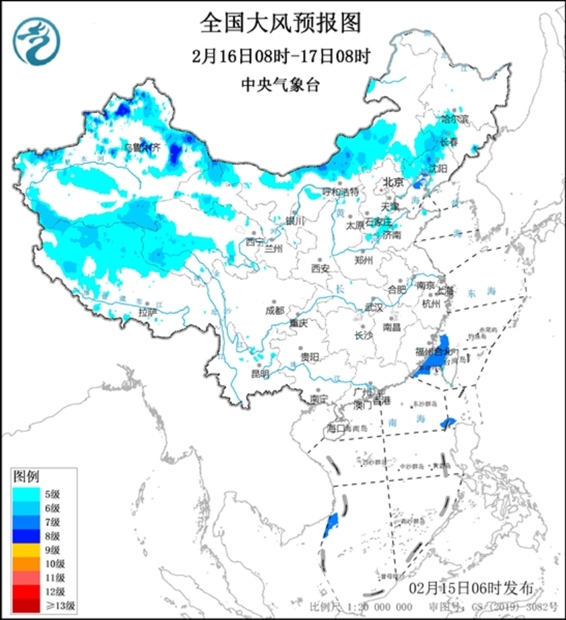 中央氣象臺(tái)2月15日06時(shí)繼續(xù)發(fā)布大風(fēng)藍(lán)色預(yù)警。預(yù)計(jì),2月15日08時(shí)至16日08時(shí),新疆北疆北部和南疆盆地、內(nèi)蒙古中西部、青海西部、甘肅西部、江蘇東部、上海大部等地將有5~6級(jí)、陣風(fēng)7級(jí)的大風(fēng);黃海大部海域、東海大部海域、臺(tái)灣海峽將有7~8級(jí)、陣風(fēng)9級(jí)的大風(fēng)(見圖1)。2月16日08時(shí)至17日08時(shí),新疆北疆北部和南疆盆地、西藏北部、內(nèi)蒙古中西部、青海西部、甘肅西部、遼寧東部、吉林東部等地將有5~6級(jí)、陣風(fēng)7級(jí)的大風(fēng),其中新疆北部的部分地區(qū)將有7~8級(jí)、陣風(fēng)9級(jí)的大風(fēng);東海西南部海域、臺(tái)灣海峽將有7~8級(jí)、陣風(fēng)9級(jí)的大風(fēng)(見圖2)。