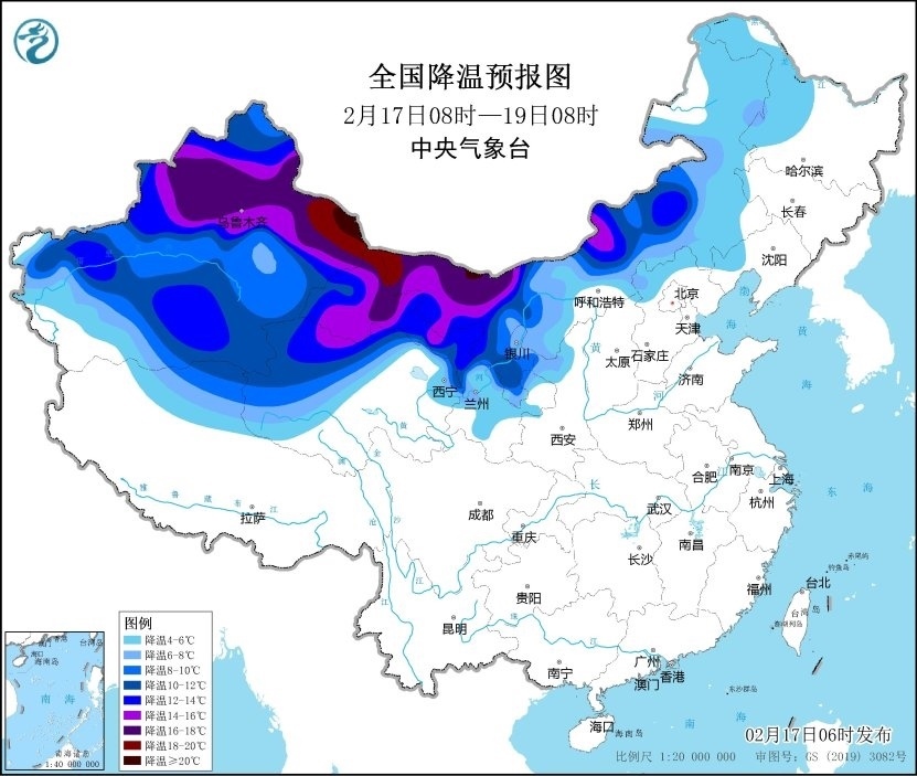預(yù)計(jì),2月17日08時至19日08時,新疆大部、內(nèi)蒙古中西部、甘肅大部、寧夏、青海北部等地將先后降溫6~12℃,其中,新疆北部、內(nèi)蒙古西部、甘肅河西等地部分地區(qū)降溫可達(dá)12~20℃,局地20℃以上。