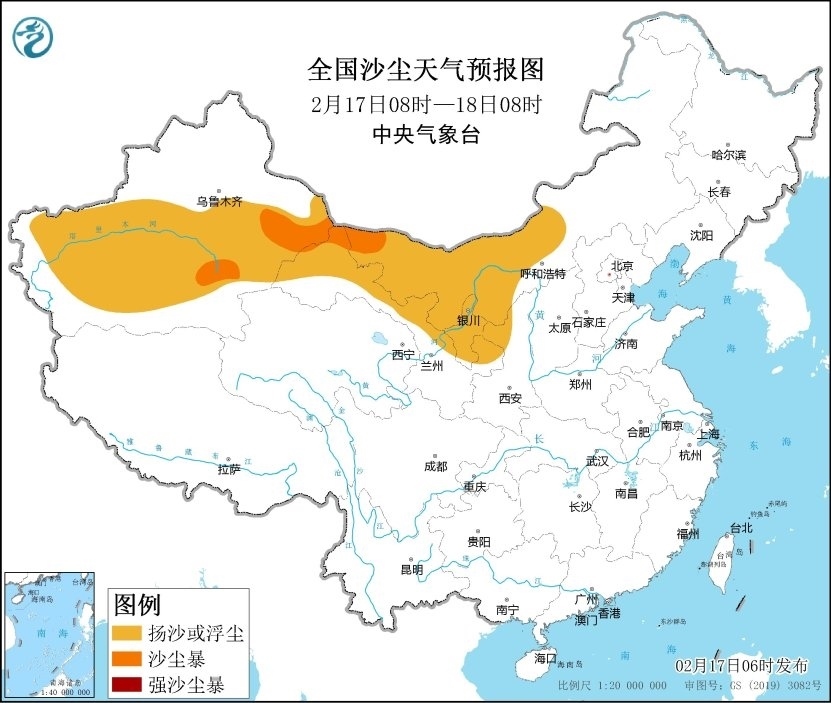 受冷空氣大風(fēng)影響,預(yù)計(jì)2月17日08時至18日08時,新疆東部和南疆盆地、內(nèi)蒙古中西部、甘肅北部、寧夏大部、陜西西北部等地的部分地區(qū)有揚(yáng)沙或浮塵天氣,新疆東部和南疆盆地東南部、內(nèi)蒙古西部、甘肅北部等局地有沙塵暴。