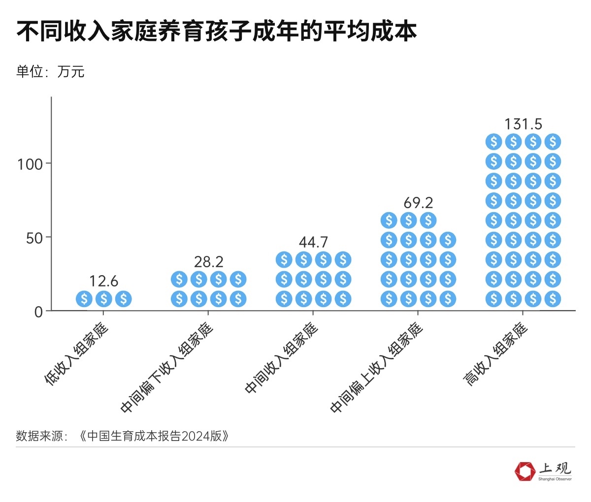 一線城市的成本則會更高。其中,在北京、上海養(yǎng)育一個孩子成年,平均成本分別達(dá)到93.6萬元、101萬元。以上海為例,養(yǎng)育孩子的開銷約占家庭收入的20%。