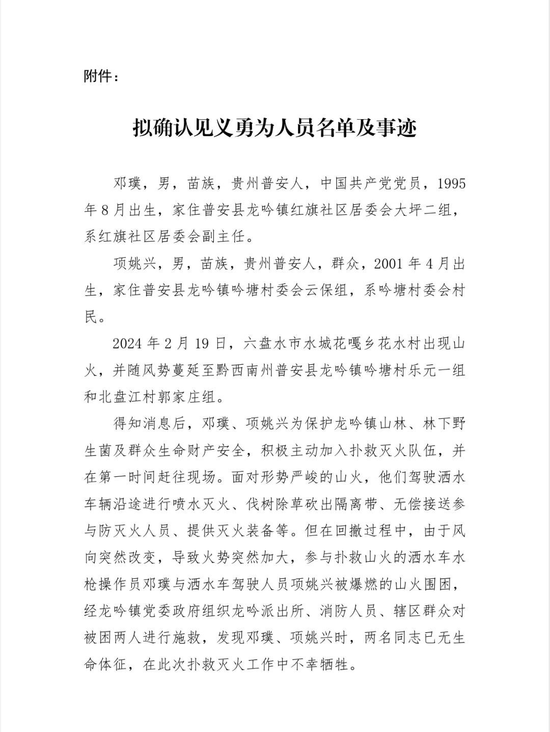 2月23日,普安縣委政法委發(fā)布公示,擬確認(rèn)犧牲的鄧璞(1995年8月出生,紅旗社區(qū)居委會(huì)副主任)、項(xiàng)姚興(2001年4月出生,吟塘村委會(huì)村民)為見義勇為人員。