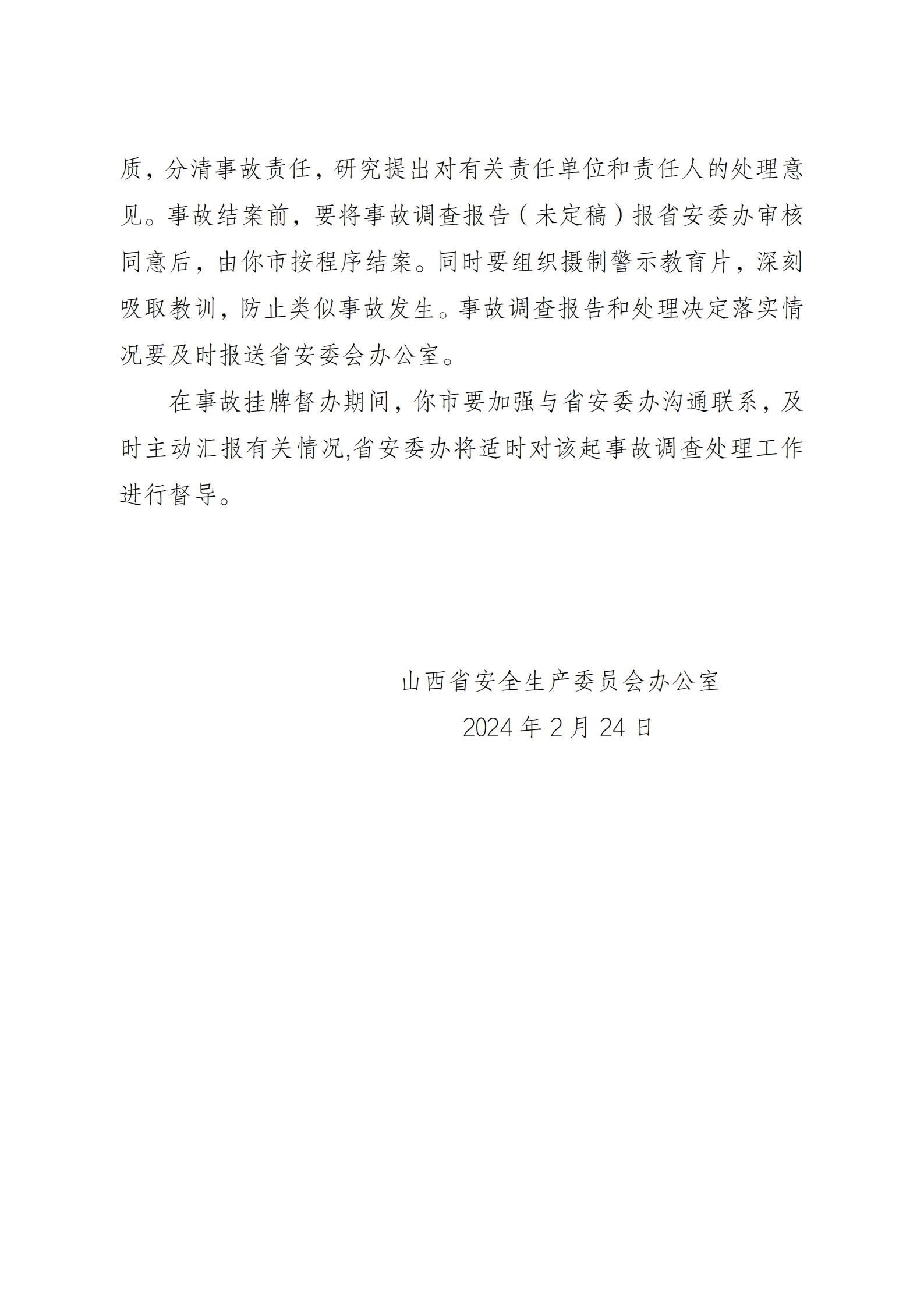 根據(jù)《國(guó)務(wù)院關(guān)于進(jìn)一步加強(qiáng)企業(yè)安全生產(chǎn)工作的通知》《山西省較大事故查處掛牌督辦辦法》等有關(guān)規(guī)定要求,山西省安委辦決定對(duì)該起事故查處實(shí)行掛牌督辦。要求呂梁市依據(jù)有關(guān)法律法規(guī)和規(guī)定,組織進(jìn)行事故調(diào)查,查明事故原因,認(rèn)定事故性質(zhì),分清事故責(zé)任,研究提出對(duì)有關(guān)責(zé)任單位和責(zé)任人的處理意見(jiàn)。事故結(jié)案前,要將事故調(diào)查報(bào)告報(bào)山西省安委辦審核同意后,由呂梁市按程序結(jié)案。同時(shí)要組織攝制警示教育片,深刻吸取教訓(xùn),防止類(lèi)似事故發(fā)生。事故調(diào)查報(bào)告和處理決定落實(shí)情況要及時(shí)報(bào)送山西省安委辦。