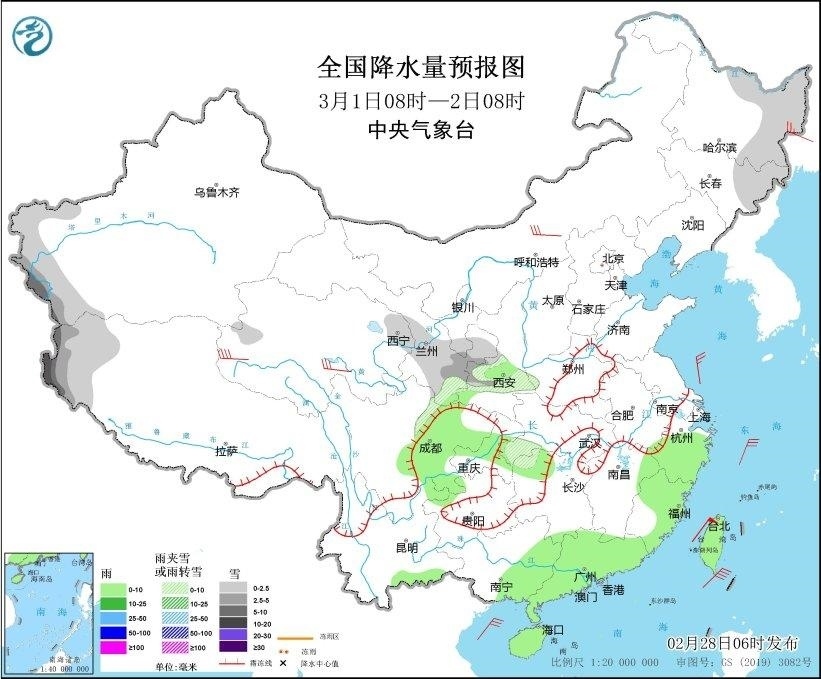 全國(guó)降水量預(yù)報(bào)圖(2月28日08時(shí)-29日08時(shí))