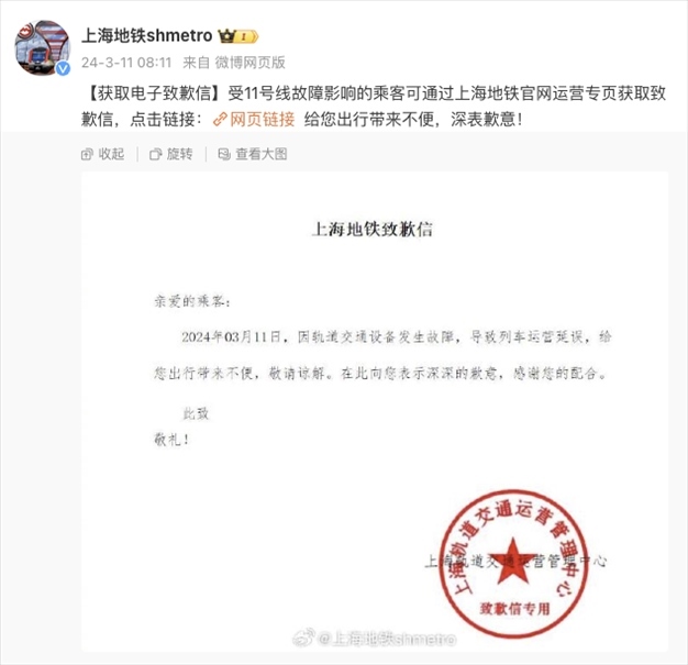 上海地鐵11號線因車輛故障限速運(yùn)行預(yù)計(jì)晚點(diǎn)15分鐘以上,官方致歉