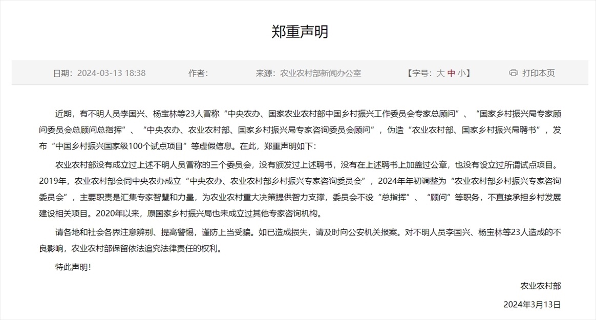 ·農(nóng)業(yè)農(nóng)村部鄭重聲明:沒(méi)有成立過(guò)不明人員冒稱的“中央農(nóng)辦、國(guó)家農(nóng)業(yè)農(nóng)村部中國(guó)鄉(xiāng)村振興工作委員會(huì)專家總顧問(wèn)”、“國(guó)家鄉(xiāng)村振興局專家顧問(wèn)委員會(huì)總顧問(wèn)總指揮”、“中央農(nóng)辦、農(nóng)業(yè)農(nóng)村部、國(guó)家鄉(xiāng)村振興局專家咨詢委員會(huì)顧問(wèn)”三個(gè)委員會(huì),沒(méi)有頒發(fā)過(guò)上述聘書(shū),沒(méi)有在上述聘書(shū)上加蓋過(guò)公章,也沒(méi)有設(shè)立過(guò)所謂試點(diǎn)項(xiàng)目。
