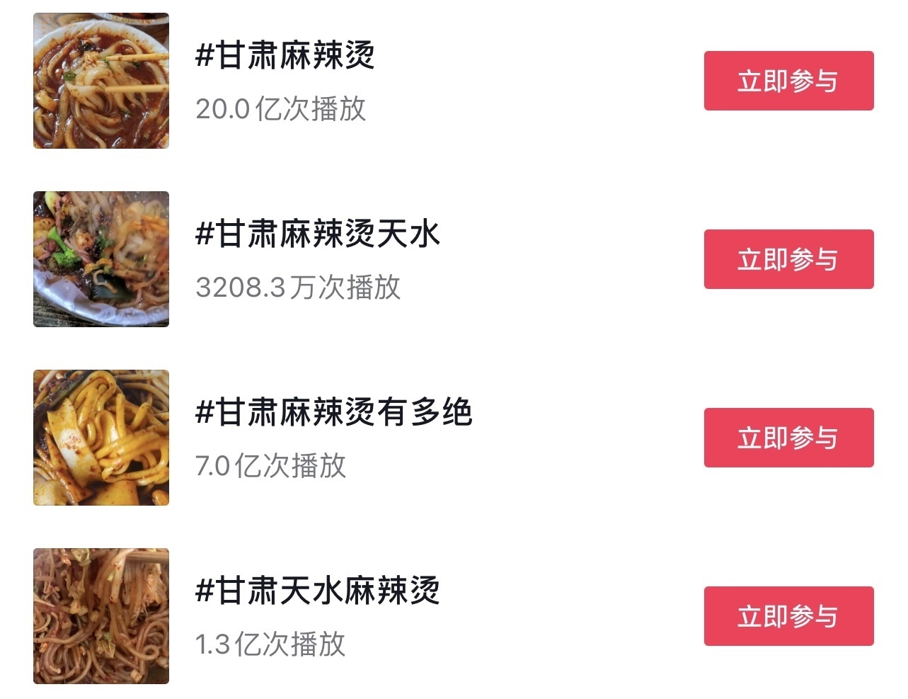 “這兩條視頻吸引了大量網(wǎng)民觀看、點贊、轉發(fā),之后陸續(xù)有網(wǎng)民發(fā)布相關視頻。”3月18日,甘肅省文化和旅游廳在回復網(wǎng)友建議中提到,3月份以來,“甘肅麻辣燙”話題迅速發(fā)酵,視頻內(nèi)容迅速增加,多次登上抖音、快手等短視頻平臺熱榜。截至3月16日18:00,各大短視頻平臺上“甘肅麻辣燙”相關話題累計播放量已超過32.6億次。