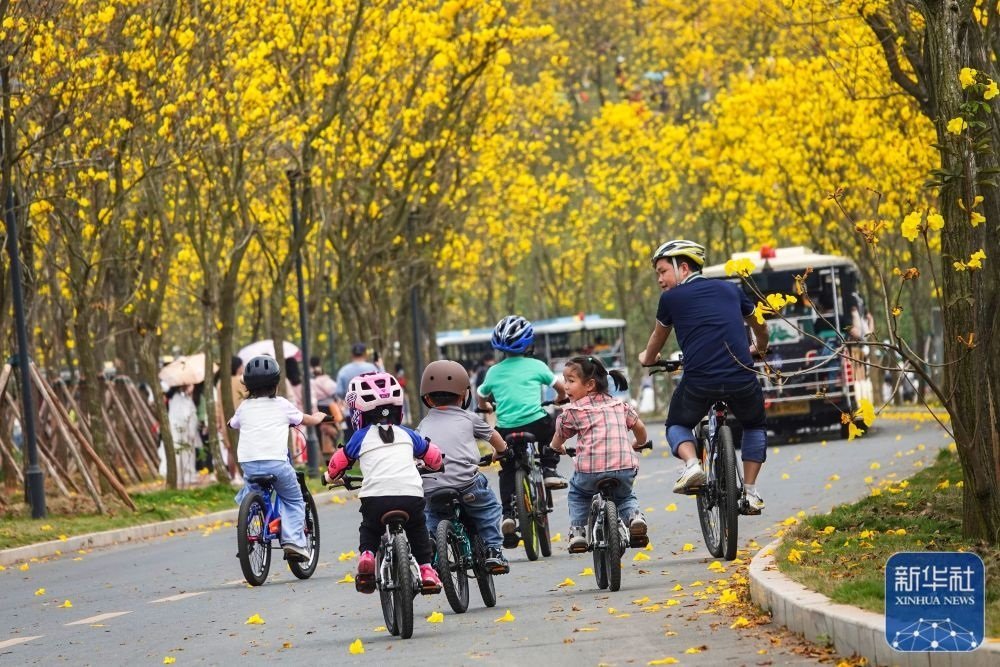 3月23日,在廣西南寧市青秀山景區(qū)風(fēng)鈴谷,游人騎自行車在黃花風(fēng)鈴木花海長廊暢游。新華社發(fā)(喻湘泉攝)
