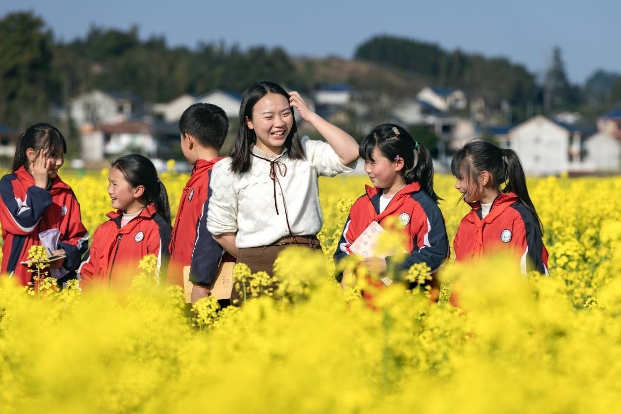 李柏霖不愿意讓孩子們覺得這樣的情緒是生活的全部。她把課堂搬到野外,在“搖搖花”開的時(shí)候帶孩子們?nèi)タ础皳u搖花”,油菜花開時(shí)去看油菜花?;ㄒ彩窃?shī),家鄉(xiāng)也是詩(shī)——若非如此,老師為什么走了又回呢?