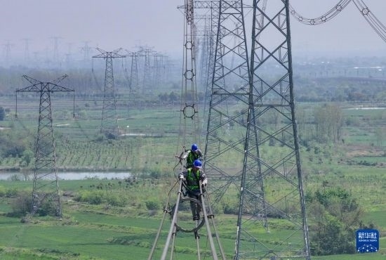4月9日,在位于安徽省合肥市廬江縣郭河鎮(zhèn)的直流±800千伏建蘇線3418號(hào)桿塔處,國網(wǎng)合肥供電公司工人進(jìn)行高空檢修作業(yè)(無人機(jī)照片)。