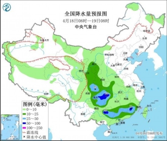 4月18日08時(shí)至19日08時(shí),甘肅南部、寧夏、陜西南部、四川盆地、重慶、貴州中東部、江漢、湖南西部和南部、江西南部、福建中南部、廣西北部、廣東中北部等地部分地區(qū)有中到大雨,其中,重慶東部、湖北西南部、湖南西北部、貴州東北部、廣西東北部、福建西南部等地部分地區(qū)有暴雨,局地有大暴雨(100~120毫米)。內(nèi)蒙古中西部、河西走廊、遼東半島、山東半島、新疆東部和南疆盆地北部等地部分地區(qū)有4~6級(jí)風(fēng)。