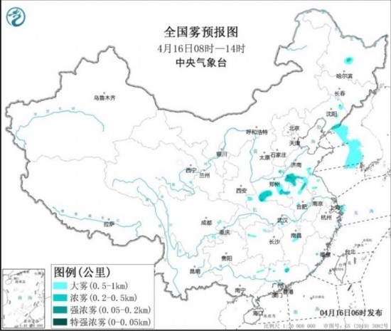 全國(guó)霧預(yù)報(bào)圖(4月16日08時(shí)-16日14時(shí))