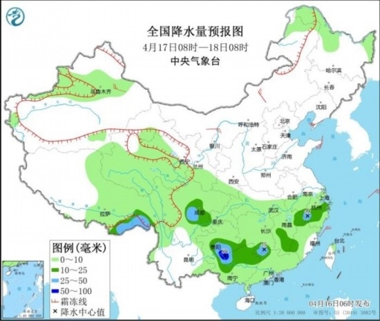全國(guó)降水量預(yù)報(bào)圖(4月16日08時(shí)-17日08時(shí))