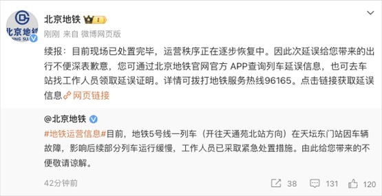 央視網(wǎng)消息:據(jù)@北京地鐵 微博消息,目前現(xiàn)場已處置完畢,運營秩序正在逐步恢復中。此前,北京地鐵發(fā)文稱,地鐵5號線一列車(開往天通苑北站方向)在天壇東門站因車輛故障,影響后續(xù)部分列車運行緩慢,工作人員已采取緊急處置措施。