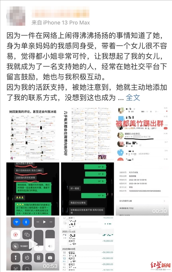 4月15日,都美竹粉絲朱姐發(fā)文稱,她先后給都美竹轉(zhuǎn)款近20萬(wàn)元,現(xiàn)在認(rèn)為都美竹“賣慘”騙錢。她希望都美竹還錢,但對(duì)方只給她轉(zhuǎn)了3萬(wàn)元。