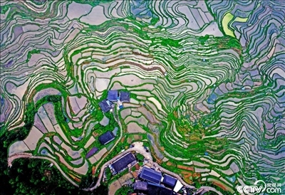 2024年4月25日,廣西柳州,苗寨的高山梯田儲水待插,層層疊疊如“大地指紋”。