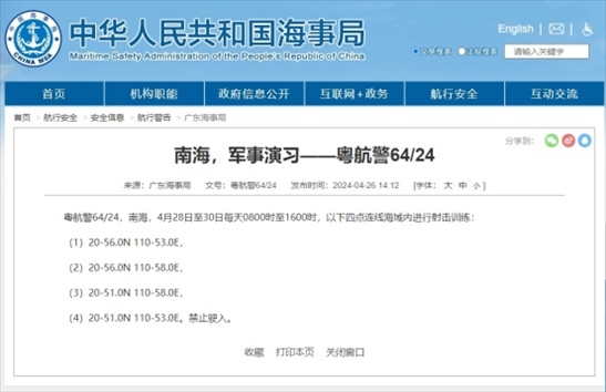 ·廣東海事局發(fā)布航行警告:南海部分海域進行射擊訓(xùn)練,禁止駛?cè)搿?/p>