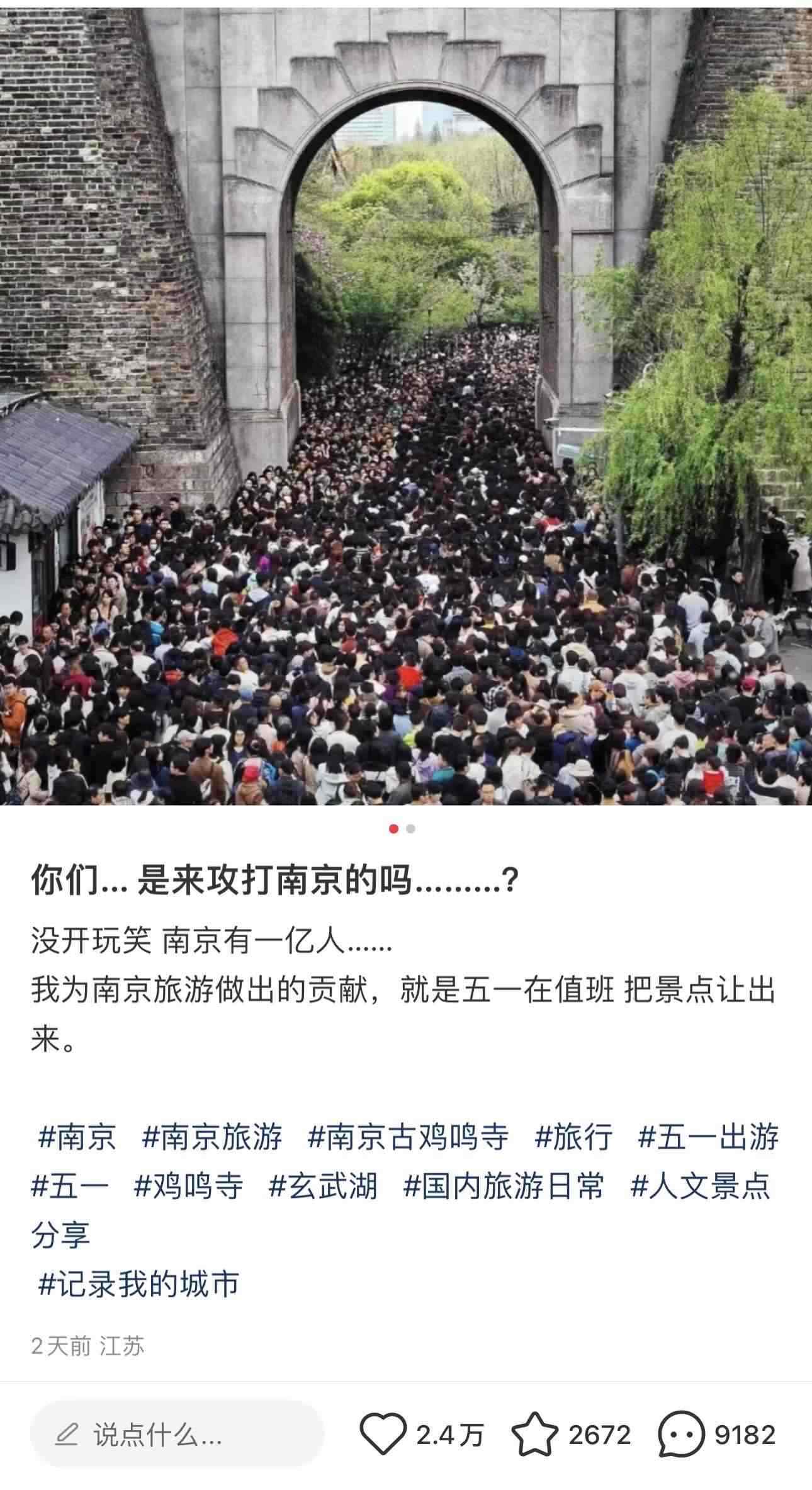 某定位顯示南京的網(wǎng)友表示:“我為南京旅游作出的貢獻,就是五一在值班,把景點讓出來?!?/p>