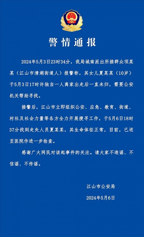央視網(wǎng)消息:據(jù)江山公安微信公眾號(hào)消息,5月6日,浙江衢州江山市公安局通報(bào),5月3日23時(shí)34分,警方接群眾項(xiàng)某某(江山市清湖街道人)報(bào)警稱(chēng),其女兒夏某某(10歲)于5月3日17時(shí)許獨(dú)自一人離家出走后一直未歸,需要公安機(jī)關(guān)幫助尋找。接警后,江山市立即組織公安、應(yīng)急、教育、街道、村社及社會(huì)力量等各方全力開(kāi)展搜尋工作,于5月6日18時(shí)37分找到走失人員夏某某,其生命體征正常,目前,已送至醫(yī)院作進(jìn)一步檢查。