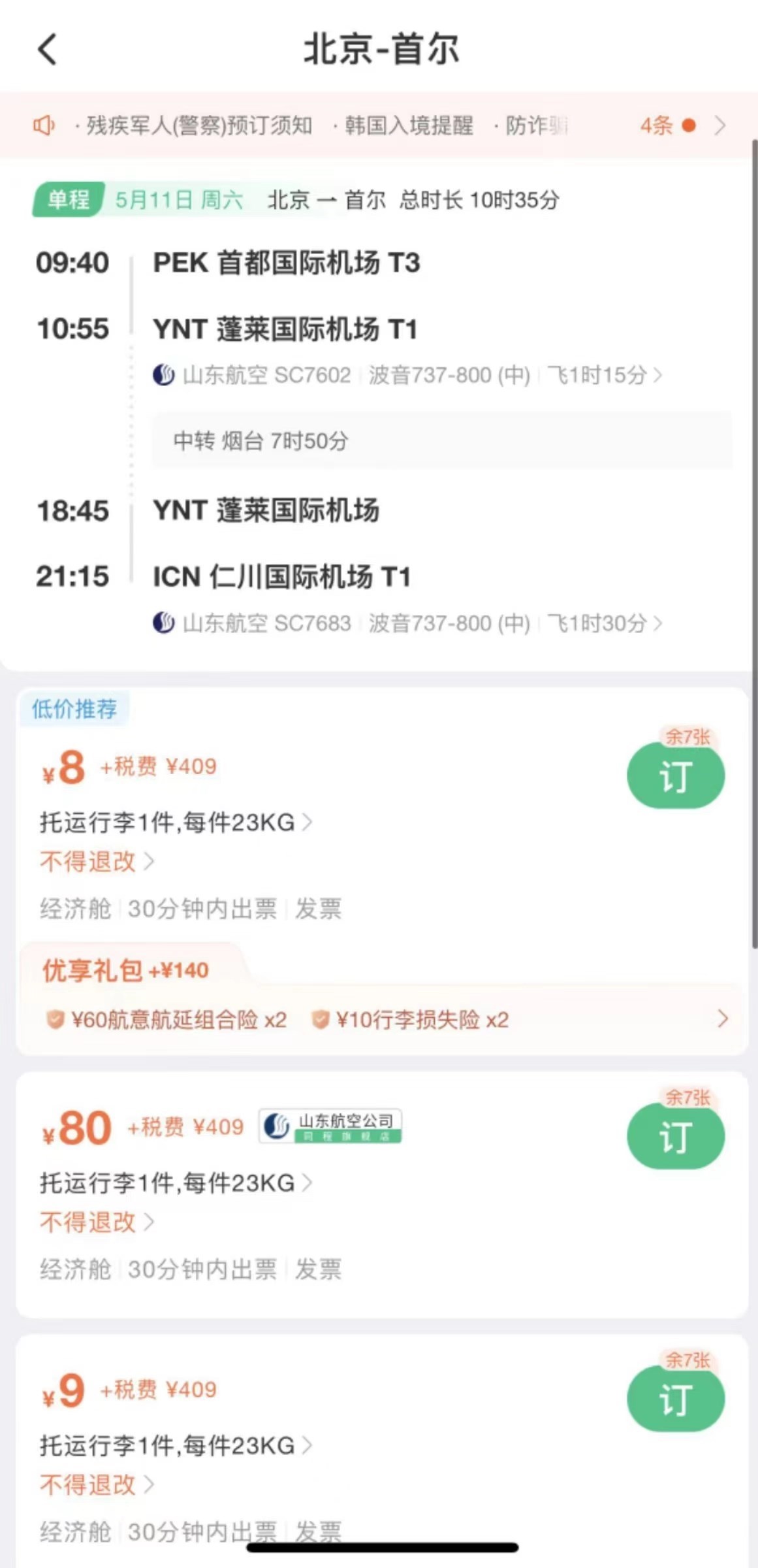 在線旅行平臺顯示,5月11日北京飛往首爾的一趟航班機(jī)票(不含稅)價(jià)格低至8元。加上稅費(fèi)之后價(jià)格是417元。