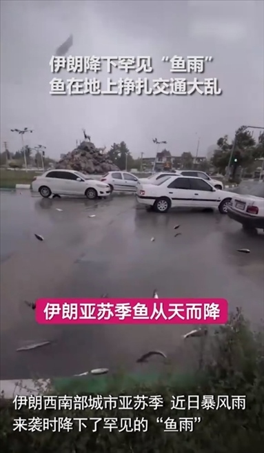 ·近日,伊朗亞蘇季市暴風(fēng)雨來(lái)襲時(shí),天空降下罕見(jiàn)“魚(yú)雨”。